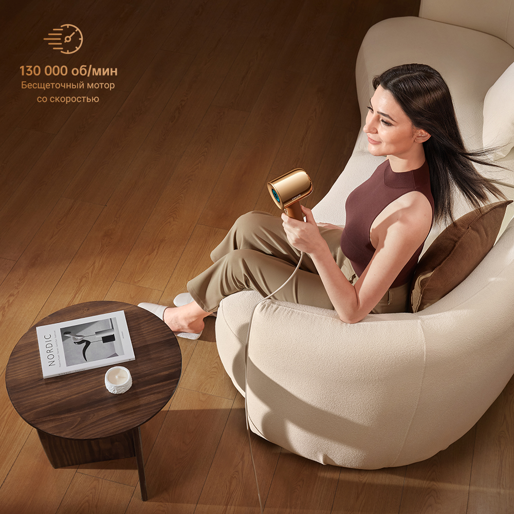 Мощный бесщеточный мотор с оптимизированной вертикальной конструкцией создает сильный поток воздуха при уровне шума менее 57 дБ. Это позволяет сушить волосы, не мешая окружающим.