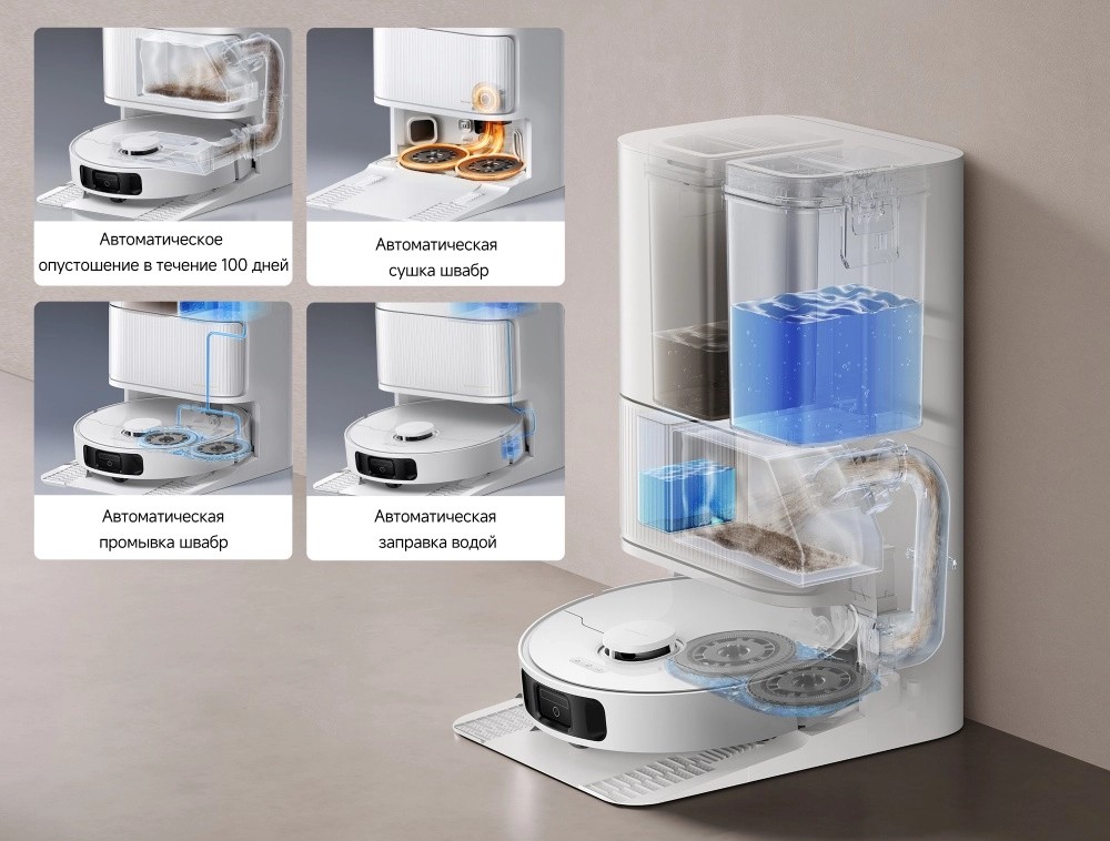 Другие функции и возможностиголосовое управление, автоматический подъем мопов, выдвижение мопов для влажной уборки