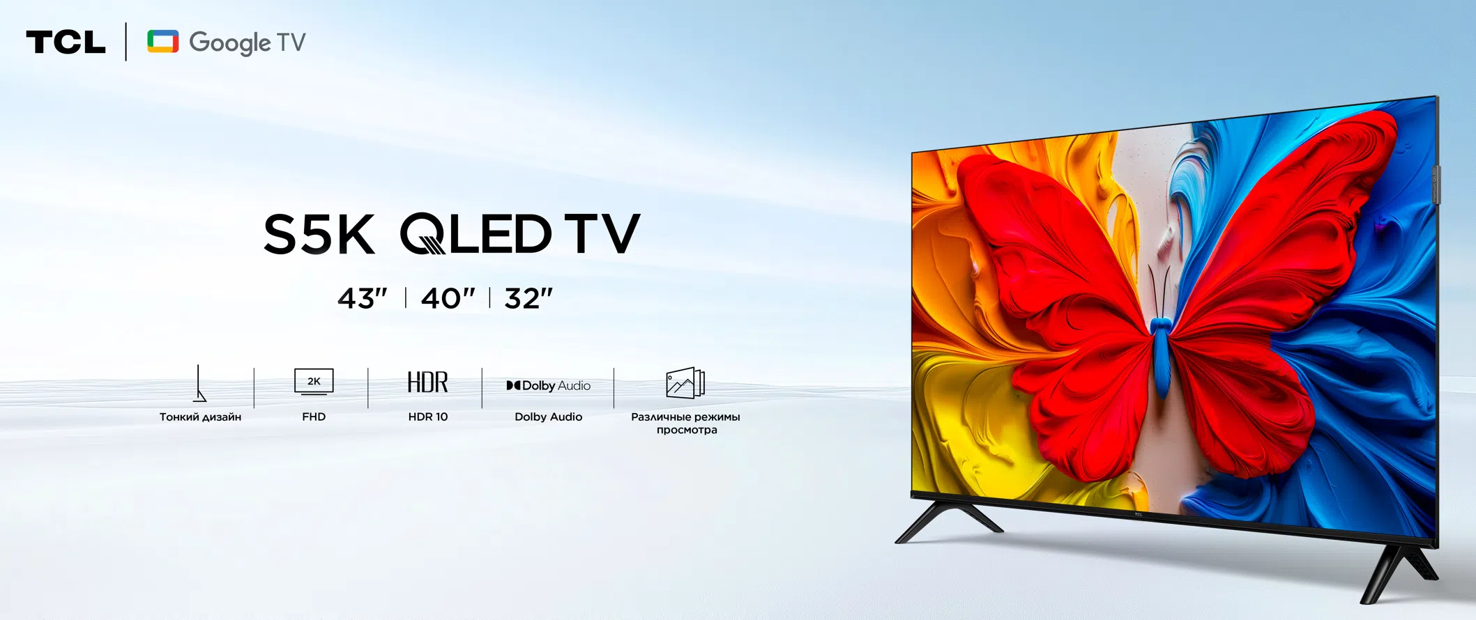 Телевизоры серии S5K выполнены в аккуратном безрамочном дизайне с тонкими рамками и лаконичной подставкой. Модель подходит как для установки на тумбу, так и для крепления на стену с помощью стандартного VESA. Внешний вид универсальный и легко вписывается в интерьер.